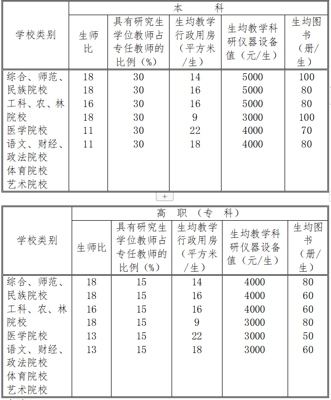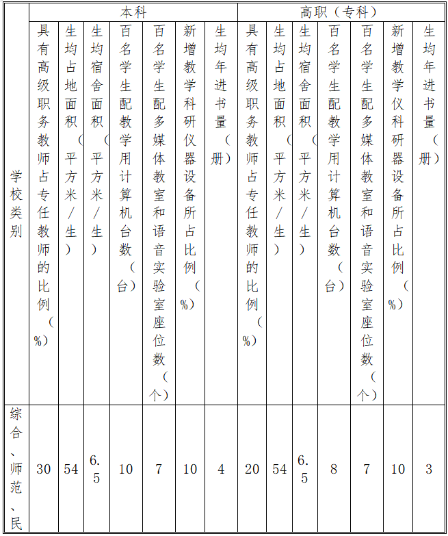 ⒉凡生师比指标不高于表中数值,且其它指标不低于表中数值的学校为合格学校。