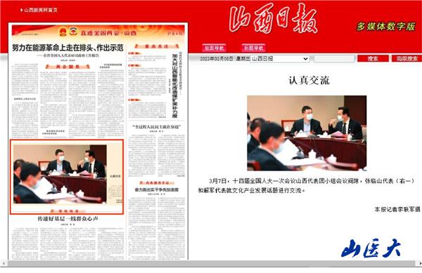 3月7日,《山西日报》第06版:“直通全国两会·山西”以大幅新闻照片的形式报道了第十四届全国人大代表、我校校长解军在十四届全国人大一次会议山西代表团小组会议间隙,与一同参会的张临山代表就文化产业发展等话题开展交流。
