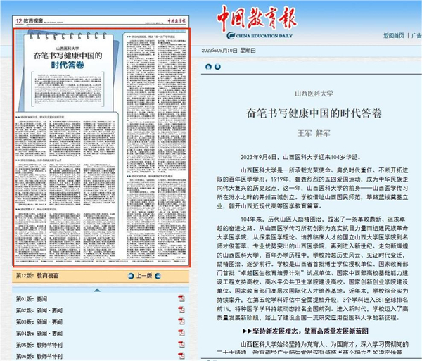 9月10日,《中国教育报》整版刊发我校党委书记王军、校长解军的署名文章《国产亚洲精品美女久久久_99久无码中文字幕一本久道_亚洲成AV人影院_亚洲AV影院一区二区三区 狠狠躁夜夜躁人人爽天天不卡_国产激情久久久久影院老熟女_精品性高朝久久久久久久 奋笔书写健康中国的时代答卷》。文章从“坚持新发展理念,擘画高质量发展新蓝图”“坚持培根铸魂,培养卓越拔尖医学人才”“坚持党管人才,精心培育领军团队”“坚持内涵发展,推进‘双一流’学科建设”“坚持文脉传承,薪火赓续百年红色基因”五个部分深度阐述了学校坚持以习近平新时代中国特色社会主义思想为指导,深入学习贯彻党的二十大精神,在省委、省政府的坚强领导下,以立德树人为根本,弘扬百年文脉和红色精神,锚定建设全国一流研究应用型医科大学的奋斗目标,努力为推进健康中国建设贡献力量的生动实践。
