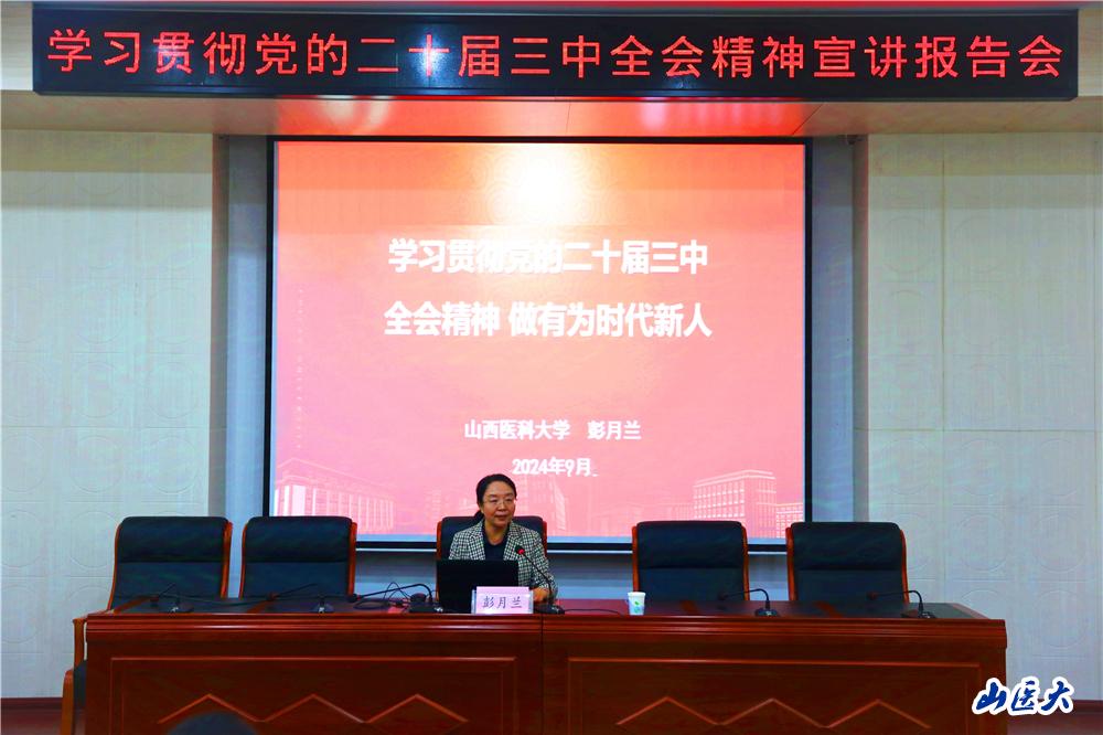 彭月兰以《学习贯彻党的二十届三中全会精神 做有为的时代新人》为题,从“学习内容”“为什么要学”和“如何学习”三个方面对党的二十届三中全会精神作了深入浅出的宣讲。她采用互动方式,以师生常见的线上线下购物税收问题及2024年度山西省科技重大专项计划“揭榜挂帅”为例,讲述进一步全面深化改革对推动中国式现代化的重大意义。通过一些基本概念的讲解,提升师生学懂《中共中央关于进一步全面深化改革、推进中国式现代化的决定》主要内容的能力。彭月兰强调,学习贯彻党的二十届三中全会精神,要厘清我国全面深化改革的历史脉络,融会贯通党的十一届三中全会、党的十八届三中全会、党的二十大和党的二十届三中全会的主要内容,深入领会新时代以来取得的历史性成就、发生的历史性变革。通过学习不断提升自身的政治能力。广大师生要把自身发展融入中国式现代化实践中,把职业发展同国家和社会需求相结合。既可以致力于生命起源这样的基础研究,也可以把解决医防协同这样的具体工作作为毕生的事业。紧跟时代步伐,努力成长为堪当民族复兴重任的时代新人。