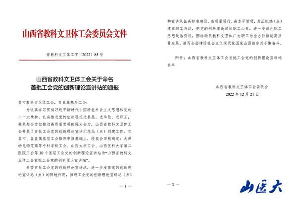 近日,山西省教科文卫体工会公布了关于命名首批工会党的创新理论宣讲站的通报,我校第二医院工会党的创新理论宣讲站被命名为山西省教科文卫体工会首批工会党的创新理论宣讲站。