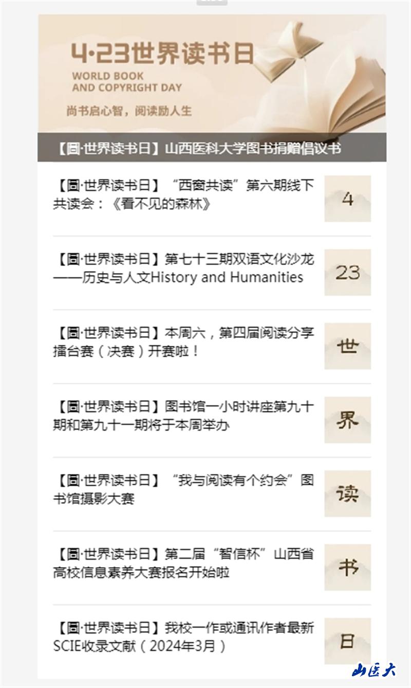 此外,为期两个月的图书馆“读书季”系列活动正在持续进行中,爱心图书捐赠活动、“尚书雅集”读书会、双语文化沙龙、西窗共读、尚书讲堂、第四届阅读分享擂台赛、“一书一电影”有奖答题、“世界很奇妙,想让你知道”21天讲座打卡、“我与阅读有个约会”图书馆摄影大赛、山西省高校信息素养大赛、山西省高校大学生书评大赛、山西省高校大学生微视频大赛等活动还有待解锁,诚邀广大师生通过学校图书馆官方微信公众号获取活动信息并积极参与活动。