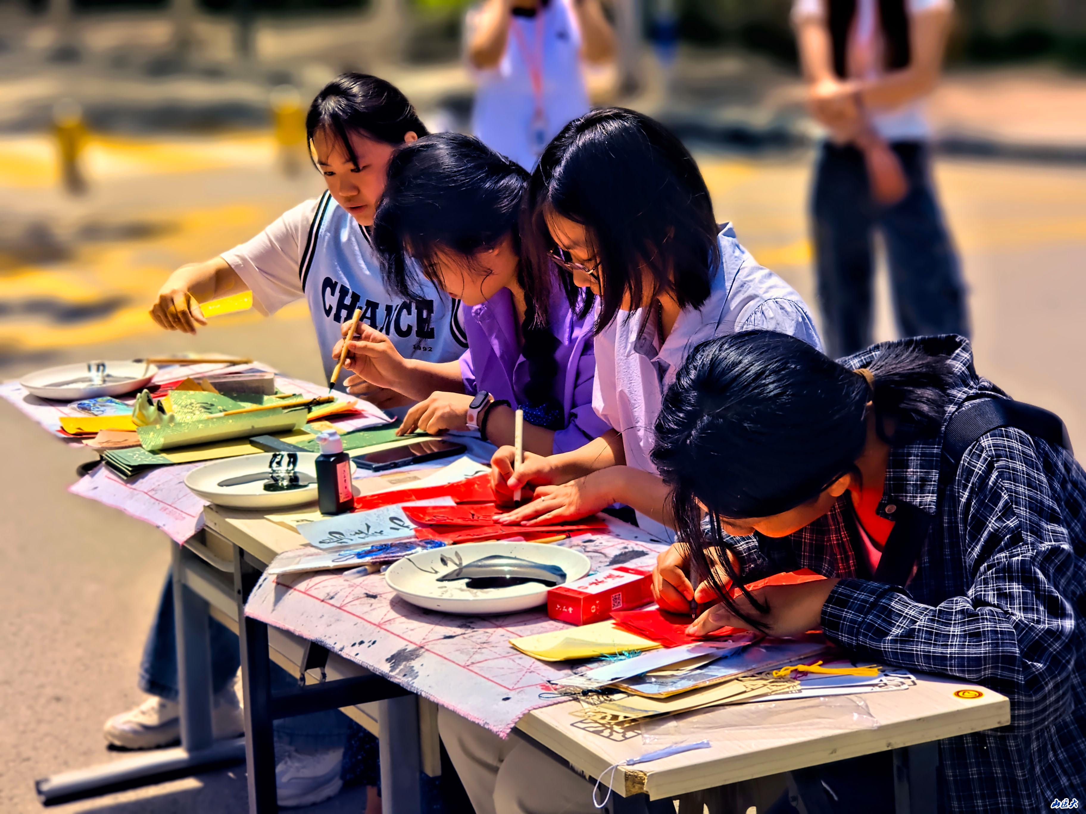 路演展示区域更是亮点频出。书法绘画协会的同学们现场挥毫泼墨,宣纸铺展间“表里山河”苍劲有力的大字跃然纸上,引得围观同学纷纷赞叹;Rhythm音乐社团带来的小提琴独奏旋律悠扬婉转,如潺潺溪流般浸润着每一位听众的心灵。民谣演唱的同学以轻柔的曲调、质朴的歌词引得大家轻声和拍哼唱;LD舞蹈社团的同学们以利落的舞步、动感的节奏将全场气氛推向高潮。