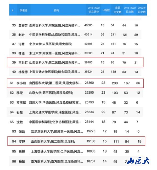 该排行榜基于2018—2022年在风湿免疫领域发表的海外论文对全国风湿免疫领域学者的学术影响力进行排名。排名结果充分肯定了我校第二医院风湿免疫科近5年在科研方面取得的佳绩和进步,也反映了科室在全国学术方面的影响力不断增强。科室在王来远、李小峰、王彩虹等带领及全科人员多年来的共同努力与积淀下,科研实力稳步提升,逐渐向具备创新能力和引领技术进步和发展的研究型学科进军。