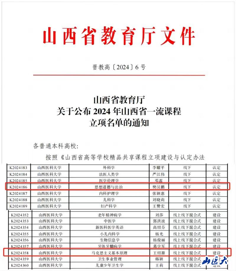 近日,山西省教育厅公布了2024年山西省一流课程评选结果,我校“思想道德与法治”和“马克思主义基本原理”两门课程获批省级精品课程。至此,加上我校马克思主义学院之前获批的2门国家级一流本科思政课程、3门山西省一流课程,我校实现了本科思政课省级以上精品课程的全覆盖。