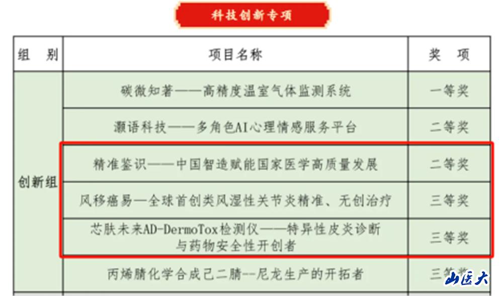 本次大赛以“挺膺担当创青春,奋楫笃行向未来”为主题,分科技创新专项、乡村振兴专项、数字经济专项、社会企业专项四个赛道,共评出一等奖12个,二等奖24个,三等奖36个。我校共入围3个项目,其中《精准鉴识——中国制造赋能国家医学高质量发展》项目获科技专项赛道创新组二等奖,《风移癌易——全球首创类风湿关节炎精准无创治疗》和《芯肤未来AD-DermoTox检测仪——特异性皮炎诊断与药物安全性开创者》分别荣获科技专项赛道创新组三等奖。