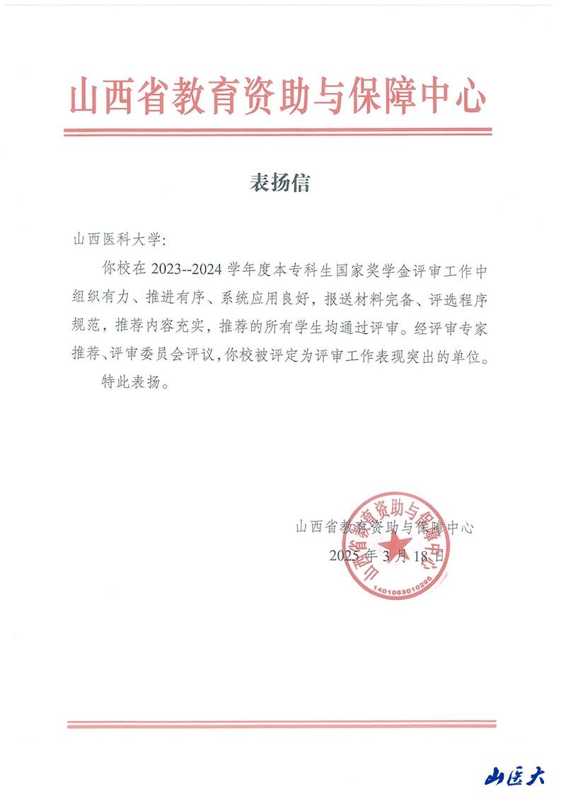 近日,山西省教育资助与保障中心向我校发来表扬信,高度肯定我校在2023-2024学年度本科生国家奖学金评审工作中的表现,授予我校“评审工作表现突出的单位”称号。
