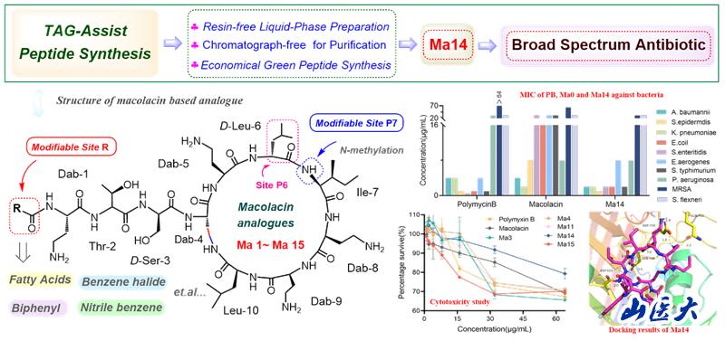 本研究以最新发现的抗生素Macolacin为研究对象,基于标签辅助多肽合成策略,全合成具有抗革兰氏阴性菌活性的侧-尾环肽Macolacin及其15个环肽的类似物,并系统研究其抗菌构效关系(SAR),为新型环肽类抗菌药物的开发提供了基础。