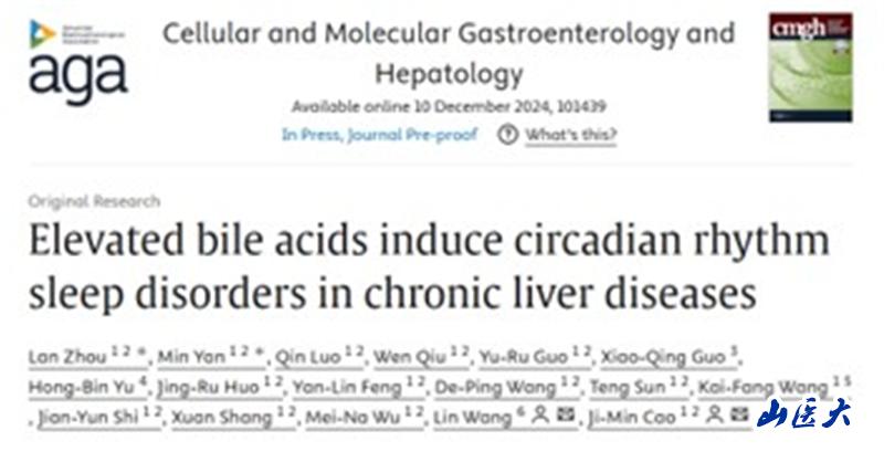 近日,我校细胞生理学教育部重点实验室曹济民教授团队在《Cellular and Molecular Gastroenterology and Hepatology》(中国科学院一区期刊)发表了题为“Elevated bile acids induce circadian rhythm sleep disorders in chronic liver diseases”的研究论文(DOI:10.1016/j.jcmgh.2024.101439),周岚副教授和博士生闫敏为共同第一作者,曹济民教授为主通讯作者。