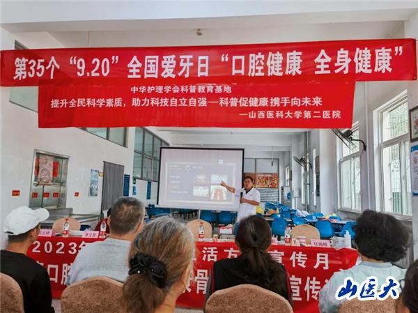 9月20日下午,我校第二医院口腔科和预防保健科为中国电子科技集团公司33所的离退休老年群众进行了以“老年口腔健康保健”为主题的科普义诊活动。口腔科马宇锋主任、李文晋副主任、张晓丽护士长及任婉峰副主任医师和邢立婷主治医师等10名医护人员参加了活动。今年是第35个“全国爱牙日”,今年爱牙日的主题是“口腔健康,全身健康”,副主题是 “关爱老年口腔,乐享健康生活”。此次活动积极响应了《健康中国行动(2019—2030年)》《健康口腔行动方案(2019—2025年)》指导方针和政策,以全面提升老年群众口腔健康素养。