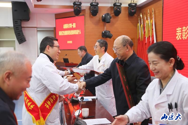 第一医院党委副书记吴旭东宣读表彰决定。重症医学科、急诊医学中心荣获“山西省卫生健康系统先进集体”“山西省卫生健康系统新冠疫情防控救治先进集体”称号;张春明、姜增誉荣获“山西省卫生健康系统先进个人”及“山西省卫生健康系统新冠疫情防控救治先进个人”称号。院领导为获得荣誉的先进集体和先进个人颁发牌匾及证书。