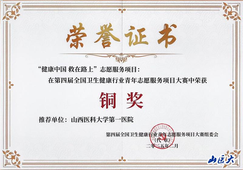 3月19日至21日,第四届全国卫生健康行业青年志愿服务项目大赛颁奖典礼暨全国卫生健康行业青年志愿服务联盟年会在北京举行,第一医院急诊医学中心“救在分秒”志愿服务队参赛项目“健康中国,救在路上”荣获铜奖。
