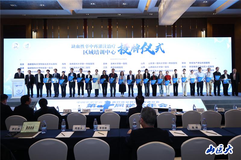 中国卒中学会医疗质量管理与促进分会在学术年会期间为首批“中国卒中学会缺血性卒中再灌注治疗区域培训中心”授牌,勉励各中心充分落实国家十四部委联合发布的《健康中国行动--心脑血管疾病防治行动实施方案(2023-2030年)》(国卫医急发[2023]31号)文件精神和国家卫生健康委员会连续四年发布的“提升急性脑梗死再灌注治疗率”这一国家医疗质量安全改进目标,进一步加强缺血性卒中再灌注治疗医疗服务能力建设,改善医疗服务质量,提升优质资源可及性,落实缺血性卒中再灌注治疗培训相关工作。