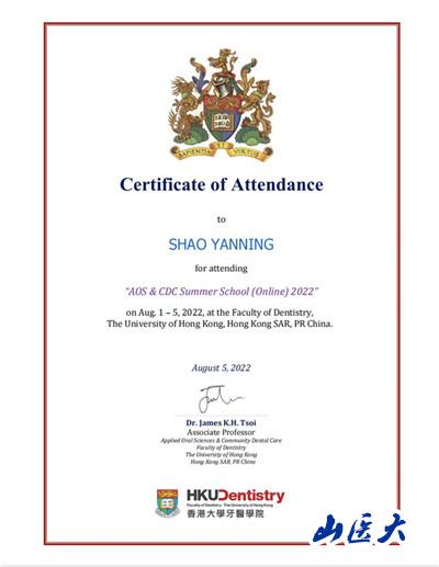 口腔医学院邵彦宁同学参加2022年暑假香港大学牙医学院线上项目并顺利结业