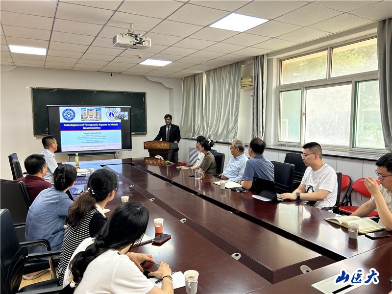 与会师生就金属神经毒性及其相关研究,与Touqeer Ahmed教授进行了深入讨论交流,报告会现场气氛活跃,思想火花迸涌,对助力高水平公共卫生学院建设起到了积极促进作用。