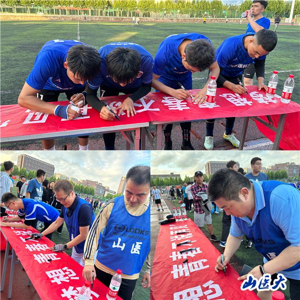 开赛前,法医学院党总支书记孙俊红、教师代表哈利对23届毕业生送上了最美好的祝福,毕业生代表哈木热提感谢学校、学院以及校足球队五年来的支持与关心,祝福学校人才辈出、桃李芬芳、蒸蒸日上。参加活动的全体师生还共同合影,并在活动宣传条幅上签名留念。