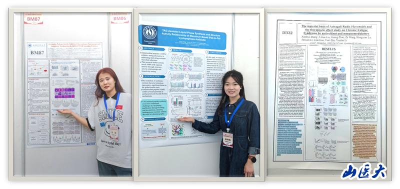 在此次会议中,我校药学院硕士研究生张璐和张林艳同学在梁泰刚教授的指导下,博士研究生张晓慧同学在李云兰教授的指导下,制作了墙报进行展示和交流。在墙报交流环节,张璐同学对“Astragalus Polysaccharide Inhibited Macrophages Necroptosis and Autophagy Dysfunction by RIPK1/TFEB Signaling Pathway”进行重点阐述,其中巨噬细胞程序性坏死和自噬功能障碍与多种疾病的发生发展密切相关,黄芪多糖的抑制作用为相关疾病的治疗提供了新的靶点和思路。张林艳同学对“TAG-Assisted Liquid-Phase Synthesis and Structure Activity Relationship of Macolacin-Based Side-to-Tail Cyclopeptides Antibiotic”进行了详细汇报,以最新发现的抗生素马可拉星为研究对象,通过标签辅助多肽合成方法,全合成了具有抗菌活性的脂环肽及15个的类似物,并系统研究其抗菌构效关系(SAR),为新型环肽类抗菌药物的开发提供了基础。张晓慧同学以“The material basis of Astragali Radix Flavonoids and the therapeutic effect study on Chronic Fatigue Syndrome by antioxidant and immunomodulatory”为题进行交流,主要涉及超声波辅助低共熔溶剂提取的黄芪黄酮类化合物通过抗炎抗氧化作用抵抗慢性疲劳综合征。