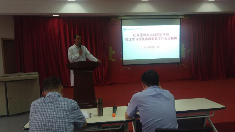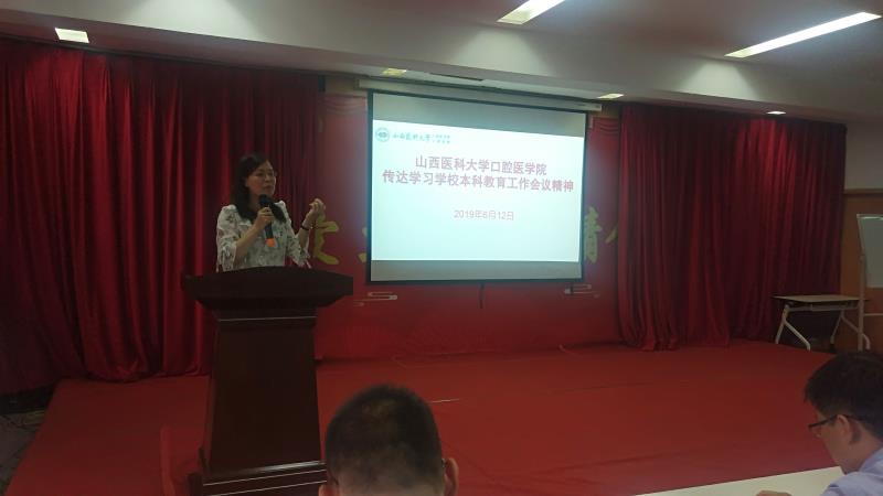 6月12日下午,我院在总院八层教室召开会议传达学习学校2019年本科教育工作会议精神。赵彬院长出席会议并讲话,党委书记任秀云主持会议,副院长李冰、葛学军及全体教学人员参加。