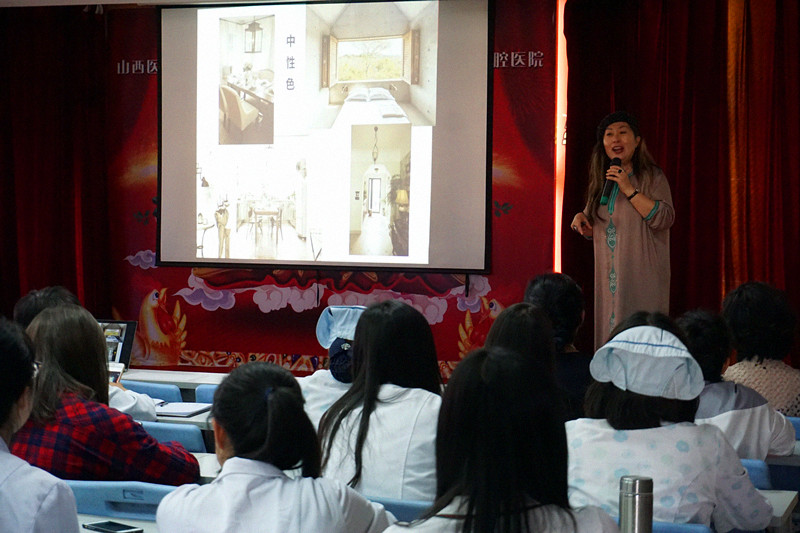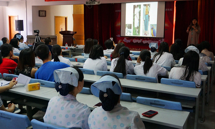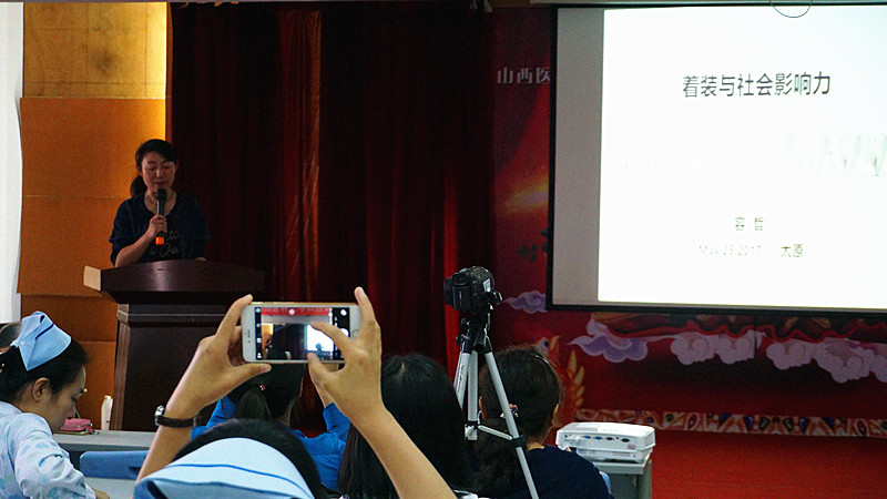 容女士针对医护和教师职业的特性,以图文并茂的形式着重讲解了色彩搭配的原则,以及在不同的职业场合中的得体着装、色彩搭配及饰物点缀等职业女性应掌握的着装技巧。容女士边讲解边示范,现场点评、与现场人员互动指导着装,诙谐幽默语言,轻松活泼的氛围赢得了大家的一致好评和掌声阵阵。