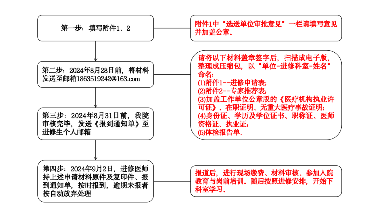 1.我院将对申请表进行审核,审核通过后将会以电话的形式进行通知,请保持电话畅通。已接到通知入科的进修人员,请携带相关申请材料,按时报到,逾期者取消当期进修资格。