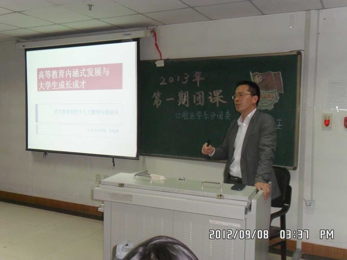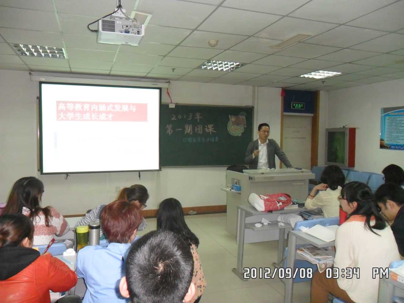 口腔医学系、口腔医院分团委于4月15—18日举办了本年度第一期团课教育活动。本次团课邀请了我校公共卫生学院书记苏天照和口腔医学系副书记殷凤主讲。口腔医学系教工、部分党员、学生入党积极分子及学生会干部50余人参加了此次学习。