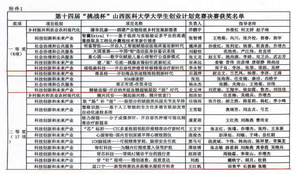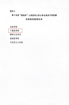 在第十四届“挑战杯”山西省大学生创业计划竞赛决赛中,由李冰教授等指导,李永智同学负责的作品《fluorescence-nano,开启恶性肿瘤骨转移精准诊疗新时代》获省级金奖;由刘君瑜副教授、王翔宇教授等指导,史玉坤同学负责的作品《糖敏齿凝——开启纳米级血糖超敏凝胶“颌”时代》获省级铜奖。