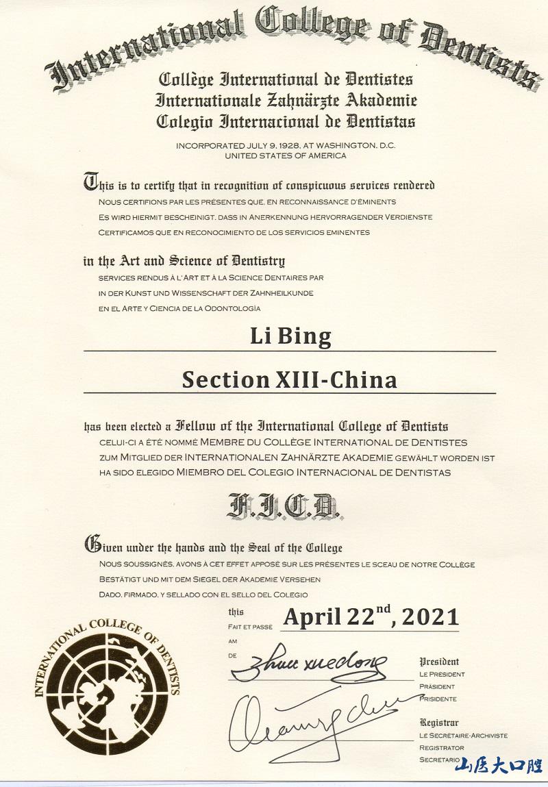 李冰教授作为我院的领军人才,为山西口腔事业的发展作出了卓越贡献。此次经山西省口腔医学会推荐被评选为国际牙医师学院院士,是近两年内唯一的山西籍新晋院士,同时也是我院继赵彬教授、任秀云教授、武秀萍教授之后又一位获此殊荣的口腔医学专家,为山西口腔赢得了荣耀。