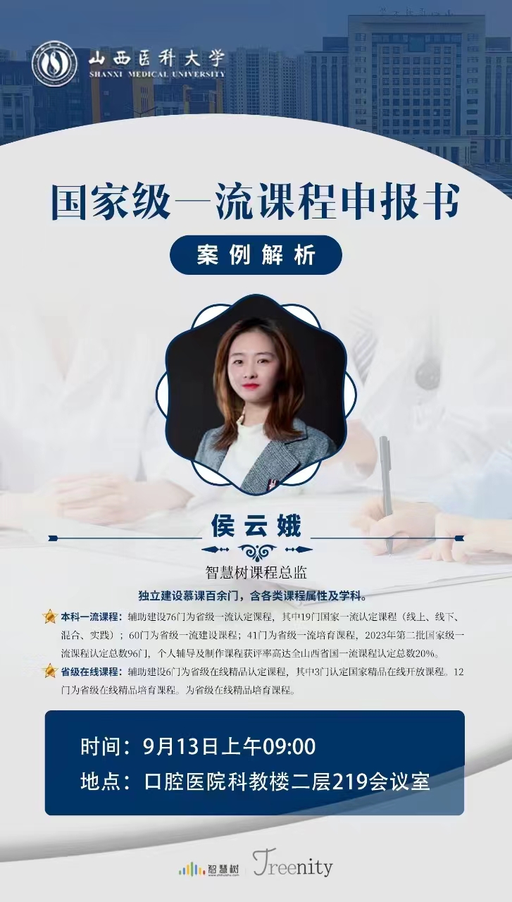 为进一步做好我院国家级一流本科课程申报工作,提高申报书撰写质量,2023年9月13日上午,应学校教务处邀请,智慧树课程总监候云娥老师在我院科教楼219会议室开展了“第三批国家级一流课程申报”专家辅导讲座,对我院如何申报第三批国家级一流课程进行了指导,并与参会教师进行了讨论交流。此次讲座由学校教务处吴晓燕老师主持,口腔医学院、一院、二院、三院等课程教师团队参加。