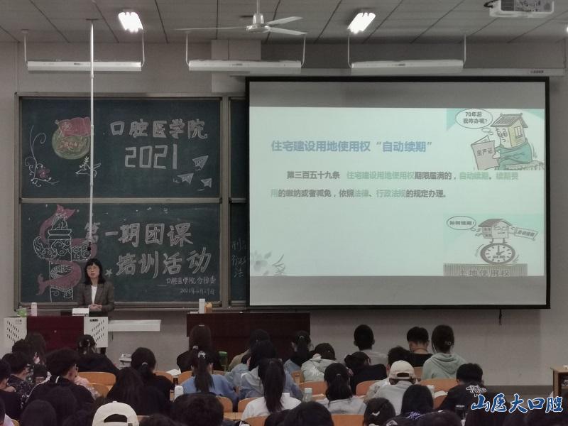 2021年4月29日晚,我院分团委于中都校区笃行楼B座102教室,举办2021年第一期团课培训活动。分团委特邀齐庆会老师进行了以“民法典与你我同行”为主题的法律讲座,旨在帮助同学们了解《民法典》,增强法律意识,提高自我保护能力。