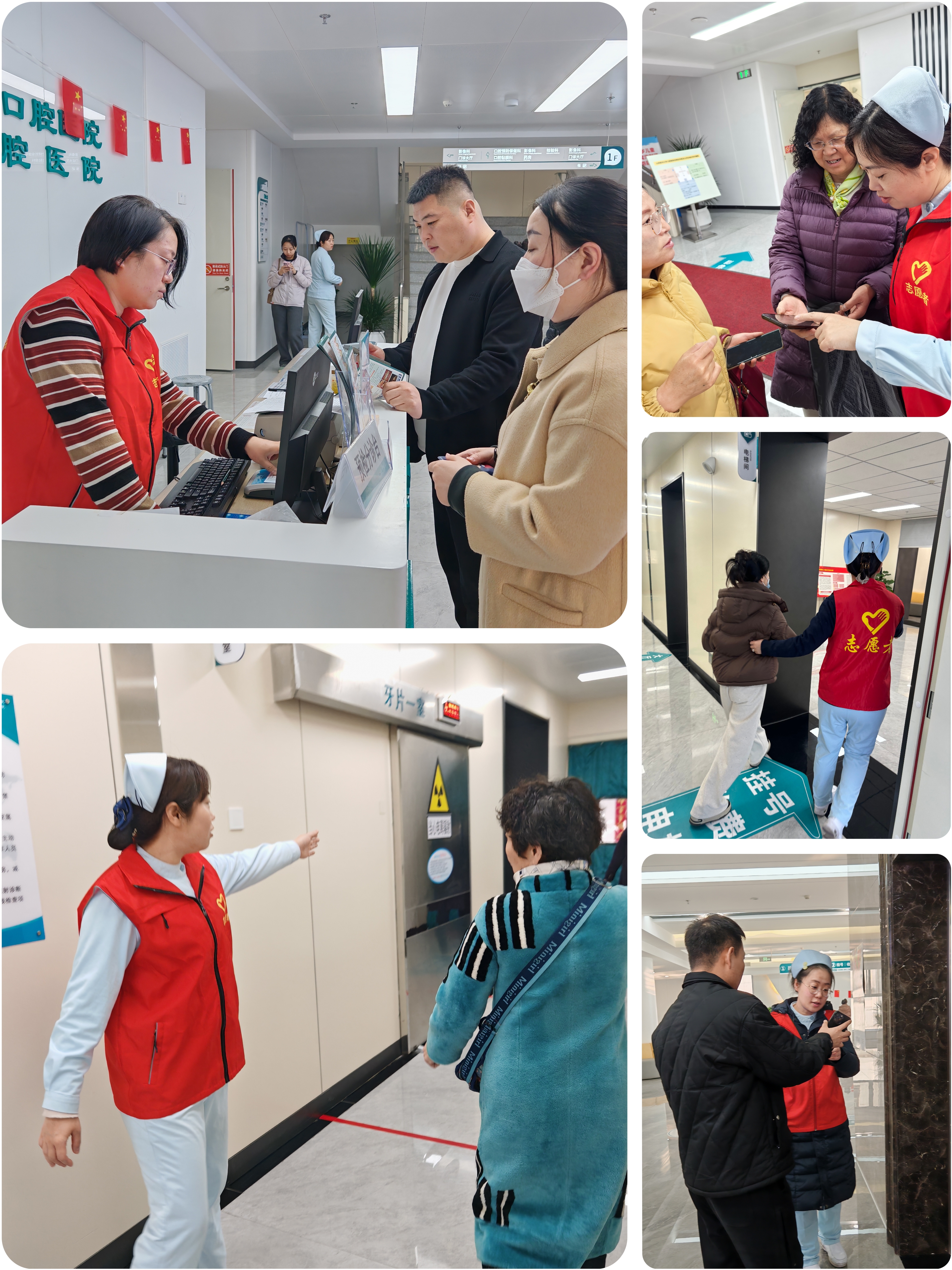 在医院门诊大厅、各楼层导诊台,党员志愿者们化身“就诊导航员”,为患者提供全流程暖心服务:协助患者挂号、填写病历,提供就医指引,陪同检查,解答疑问。