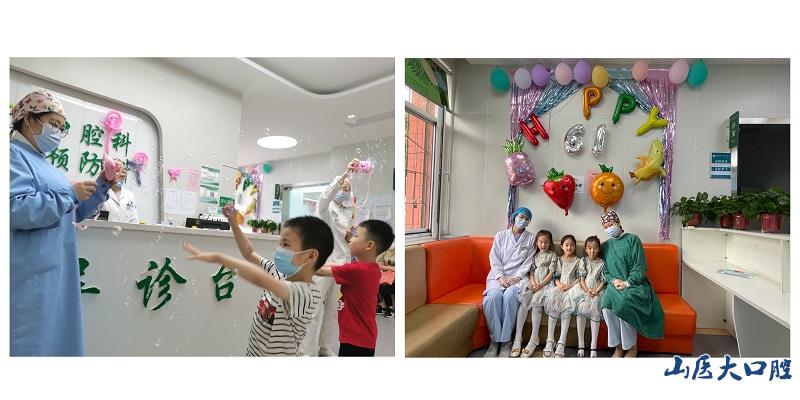 本次活动中,儿口预防科的医护团队精心装饰了候诊区、导诊台等区域,并且准备了画笔、图纸、彩色气球、蜡笔等小礼物。五彩斑斓的就诊环境、可爱的小礼物、亲切的医护人员极大地舒缓了孩子们看牙时的焦虑情绪,为我科在临床诊疗中持续开展儿童口腔的舒适化治疗提供了经验模式。