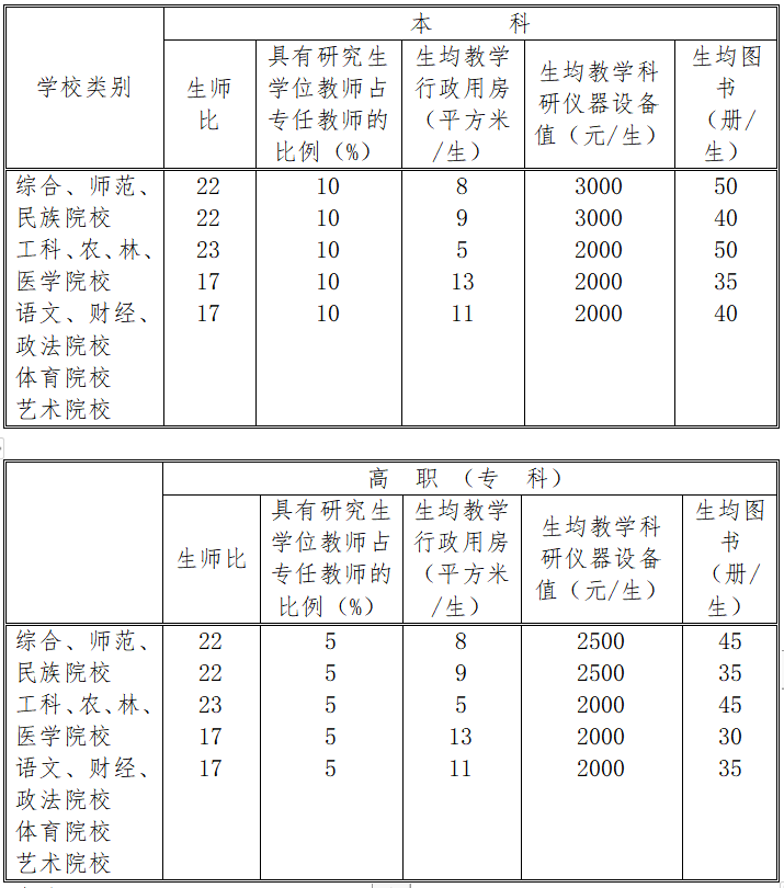 ⒉凡生师比指标不高于表中数值,且其它指标不低于表中数值的学校为合格学校。