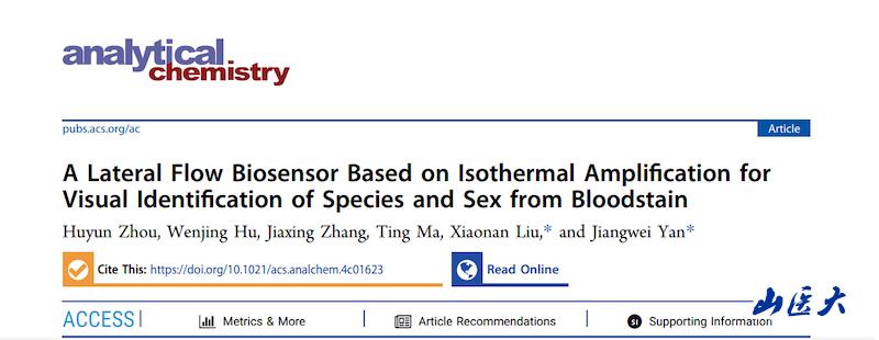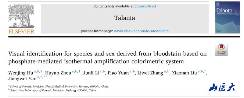 近日,我校法医学院严江伟教授创新团队以犯罪现场生物检材即时检测为目的做出系列研究成果,在国际分析化学领域顶级期刊Talanta、Analytical Chemistry上先后发表了题为“Visual identification for species and sex derived from bloodstain based on phosphate-mediated isothermal amplification colorimetric system”“Lateral Flow Biosesensor Based on Isothermal Amplification for Visual Identification of Species and Sex from Bloodstain”的研究论文。两篇论文将等温扩增技术分别与磷酸盐介导的比色法及侧向流层析装置相结合,可实现犯罪现场痕量血痕的种属和性别即时鉴定。