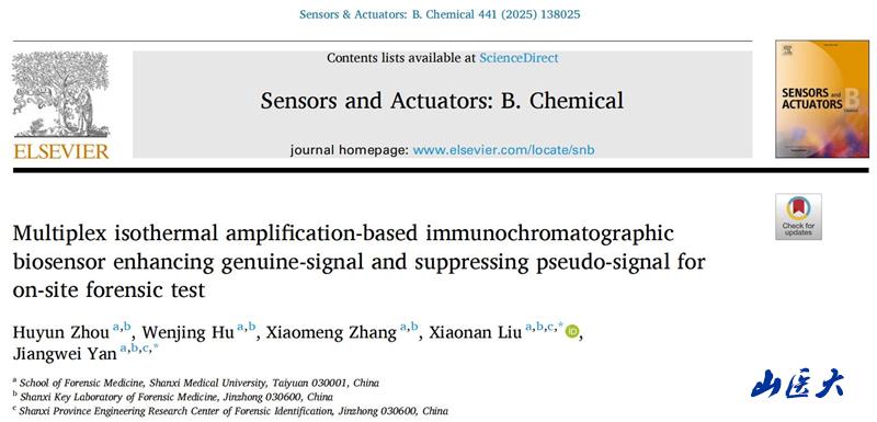 近日,我校法医学院严江伟教授团队在国际分析化学领域顶级期刊《Sensors and Actuators B: Chemical》上发表了题为“Multiplex isothermal amplification-based immunochromatographic biosesensor enhancing genuine-signal and suppressing pseudo-signal for on-site forensic test”的研究成果。