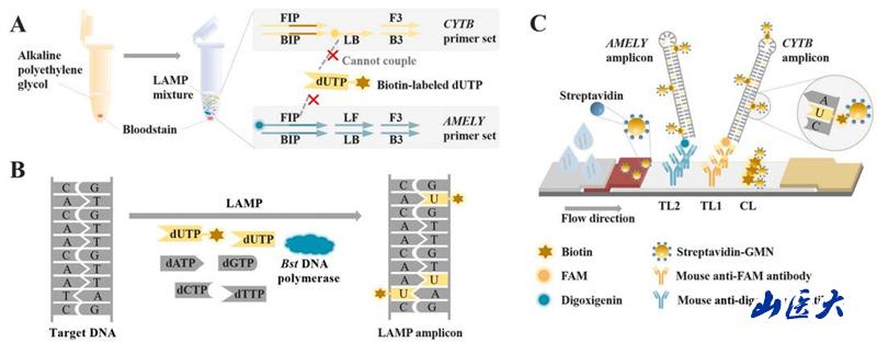 案件现场的生物检材可提供重要的遗传学信息以推动案件侦破。然而,由于犯罪嫌疑人对案件现场的破坏,获取的生物检材往往是痕量或降解的。因此,需要从痕量样本中同时鉴定多个靶标以获取尽可能多的生物学信息。尽管多重环介导等温扩增结合免疫层析的方法可进行痕量样本分析,但在多重环介导等温扩增中,多个靶标共享底物,使得每个靶标的可检测扩增产物减少,从而导致免疫层析试纸条上的显色信号较弱。此外,该方法无法防止引物二聚体造成的假阳性结果。