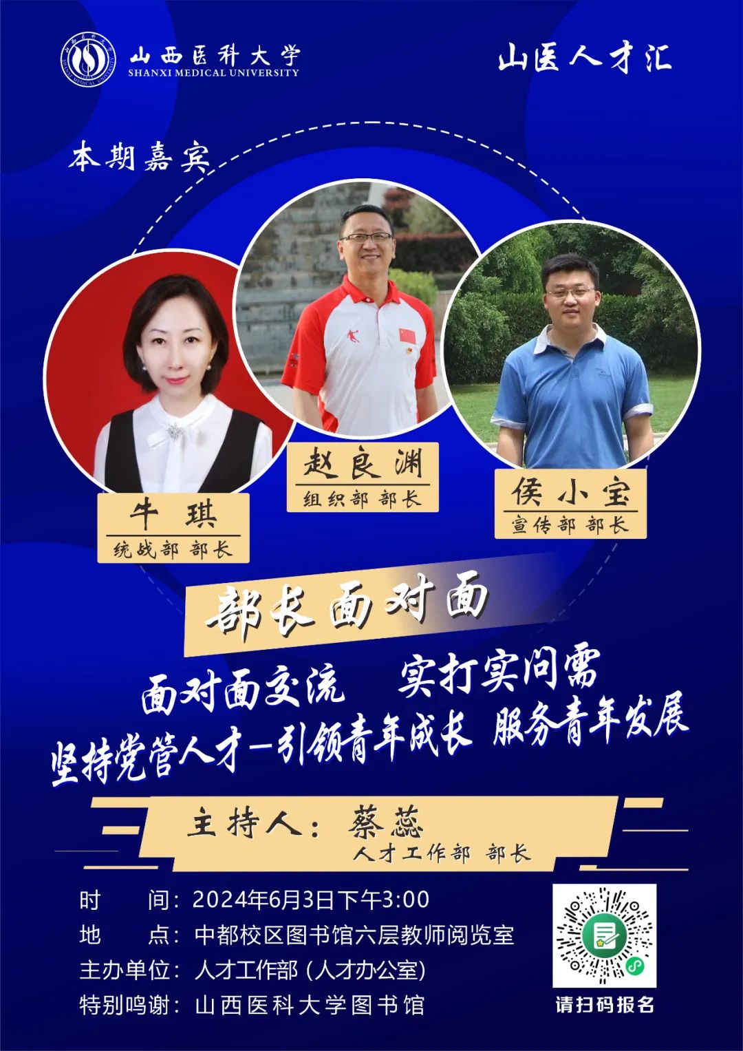 “山医人才汇”品牌活动,继“书记邀约”“校长零距离”之后,持续推出“部长面对面”“院长点对点”“导师手把手”系列人才活动,引领人才发展,托举人才成长。面对面交流,实打实问需。欢迎大家持续关注,诚邀大家积极参加。