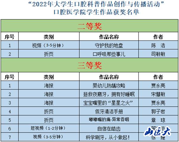近日,中华口腔医学会公布了2022年大学生口腔科普作品创作与传播活动作品入选名单,我校口腔医学院荣获二等奖2项,三等奖7项。