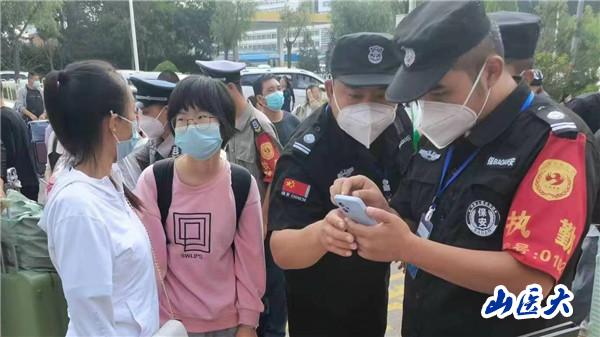 在校门口,安保人员严格执行疫情防控有关要求,严格落实新生“四码一书一测”(四码:扫场所码、行程码、健康码、核酸采样码,一书:入学通知书,一测:测量体温)入校检查制度,校外无证人员、外来车辆及无牌电动车严禁入校,严守学校疫情防控第一道防线。