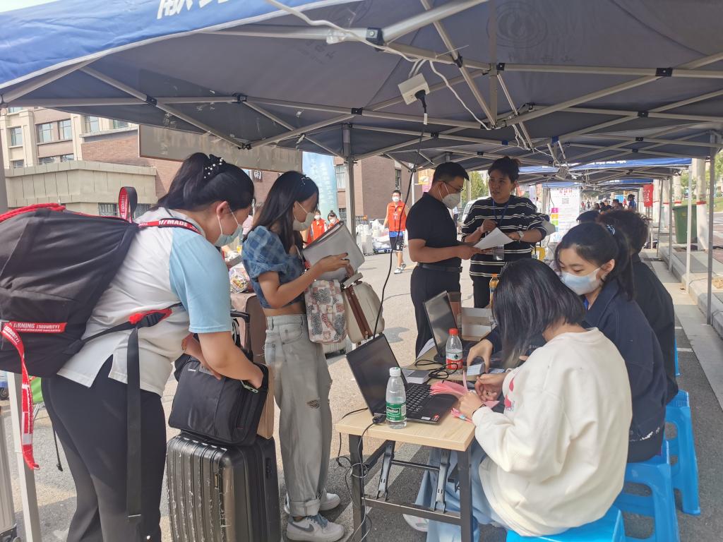 2022年迎新季,在疫情防控常态化的要求下,学校成立了以校领导为组长的秋季开学疫情防控专班,工作专班下设10个工作组,各工作组相互配合,通力合作,为新生提供全程无忧的“一站式”贴心服务。火车、高铁、汽车到站,有人相伴,辅导员老师们已在出口等候多时。新生进入校门前,扫描场所码进行核验,由保卫处、校医院工作人员对同学们进行测温,并对随身携带行李进行消杀。进入校门后,新生在志愿者的指引帮助下,进行入校核酸检测。在校园内,根据道路两旁醒目的横幅和指示牌,可以迅速找到各学院的报到点,在杏雨楼前临时搭成的“迎新大道”上,各学院的报到工作正有条不紊地进行,新生只需按照流程就可以迅速办完入学手续,整个过程既明晰又高效;学校的迎新大屏上实时显示累计报到人数、各院系报到统计等信息,新生完成报到后,迎新大屏上就会实时显示,方便学校掌握新生来校报到情况。