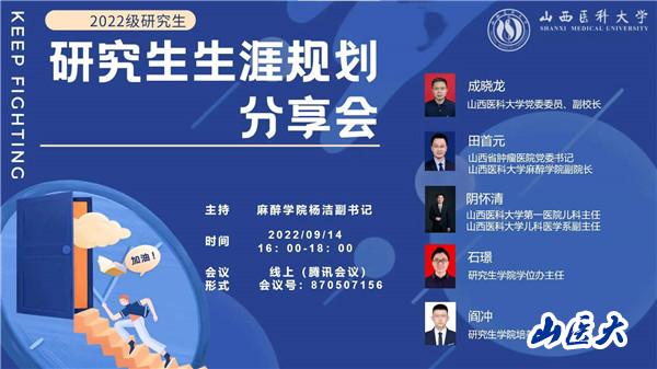 9月14日下午,迎泽校区疫情防控专班第四组线上举办了研究生生涯规划分享会。会议邀请了校党委常委、副校长成晓龙,附属肿瘤医院党委书记、麻醉学院副院长田首元,第一医院儿科主任、儿科医学系副主任阴怀清,研究生学院学位办主任石璟,研究生学院培养科科长阎冲进行专题分享,工作组辅导员刘斌、范晋楠、范静和在酒店静态管理的全体研究生参加会议。会议由工作组组长、麻醉学院党总支副书记杨洁主持。