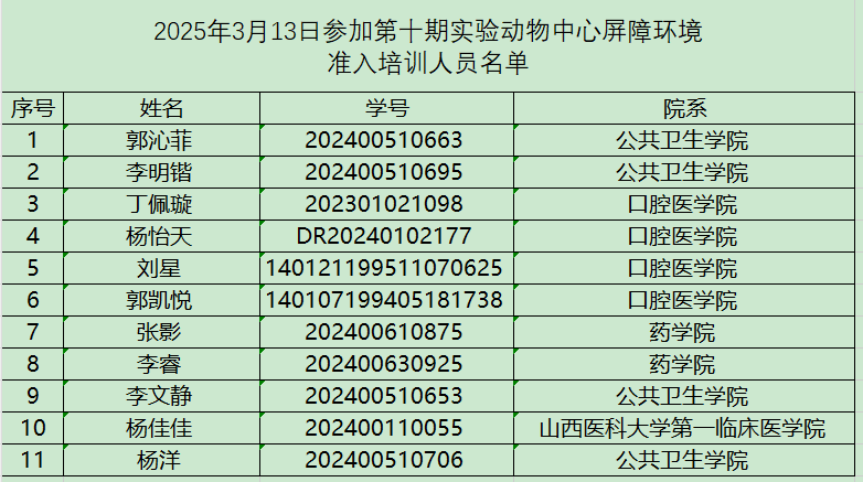 2025年3月13日参加第十期屏障环境准入培训人员名单-实验动物中心
