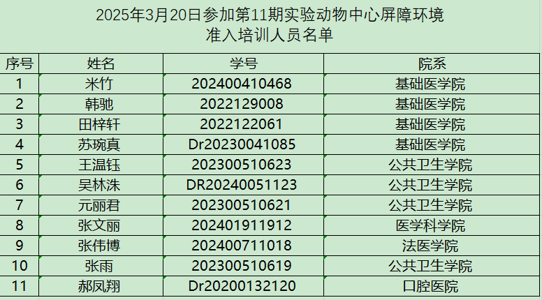 2025年3月20日参加第11期屏障环境准入培训人员名单-实验动物中心