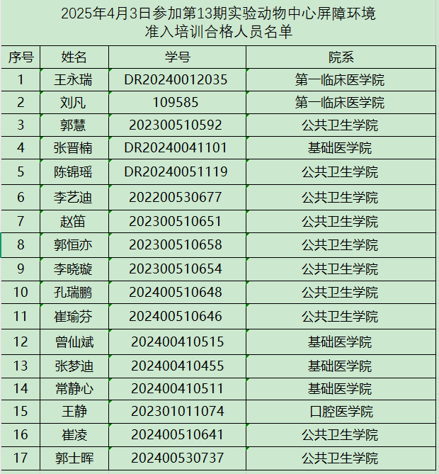 第13期屏障环境准入培训合格人员名单-实验动物中心