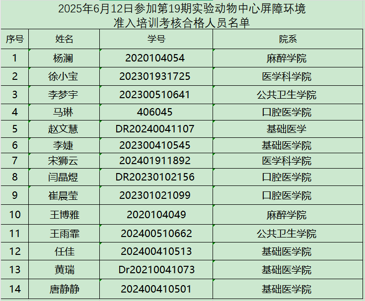 第19期屏障环境准入培训合格人员名单-实验动物中心