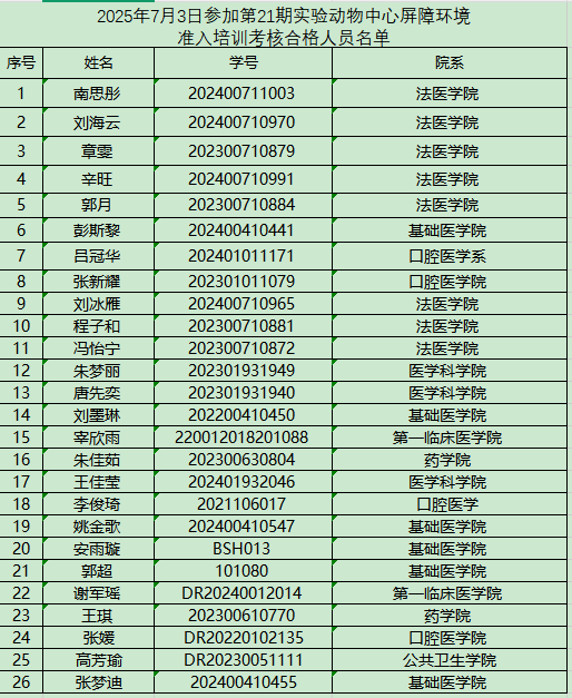 第21期屏障环境准入培训合格人员名单-实验动物中心