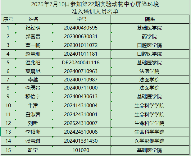 请以下参培人员于2025年7月10日下午14:30到实验动物中心三层多功能会议室参加培训和考试!