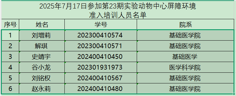 第23期屏障环境准入培训人员名单-实验动物中心