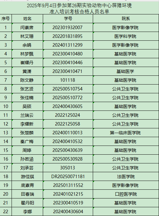 第26期屏障环境准入培训合格人员名单-实验动物中心