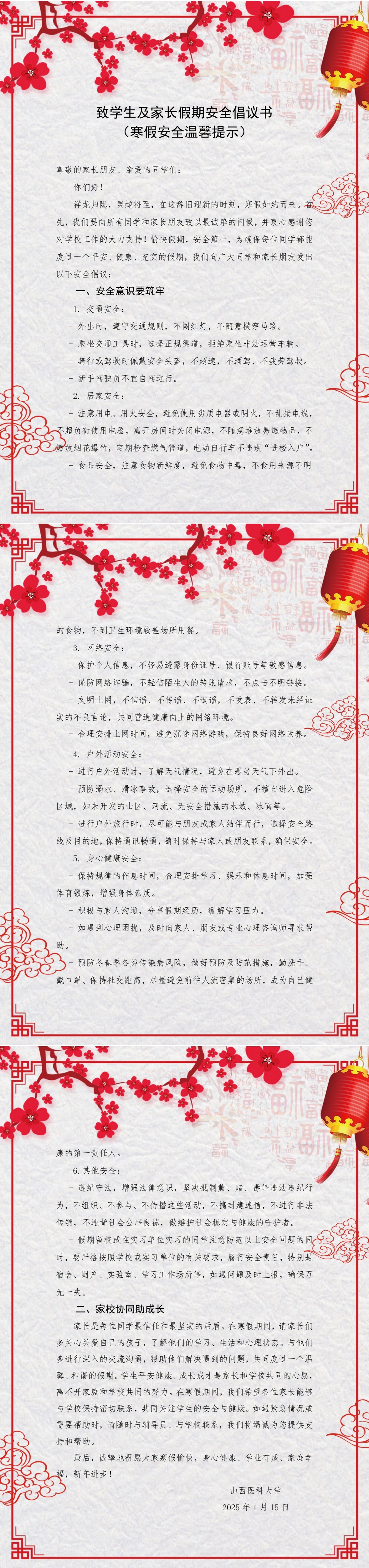 致学生及家长假期安全倡议书-学生工作部