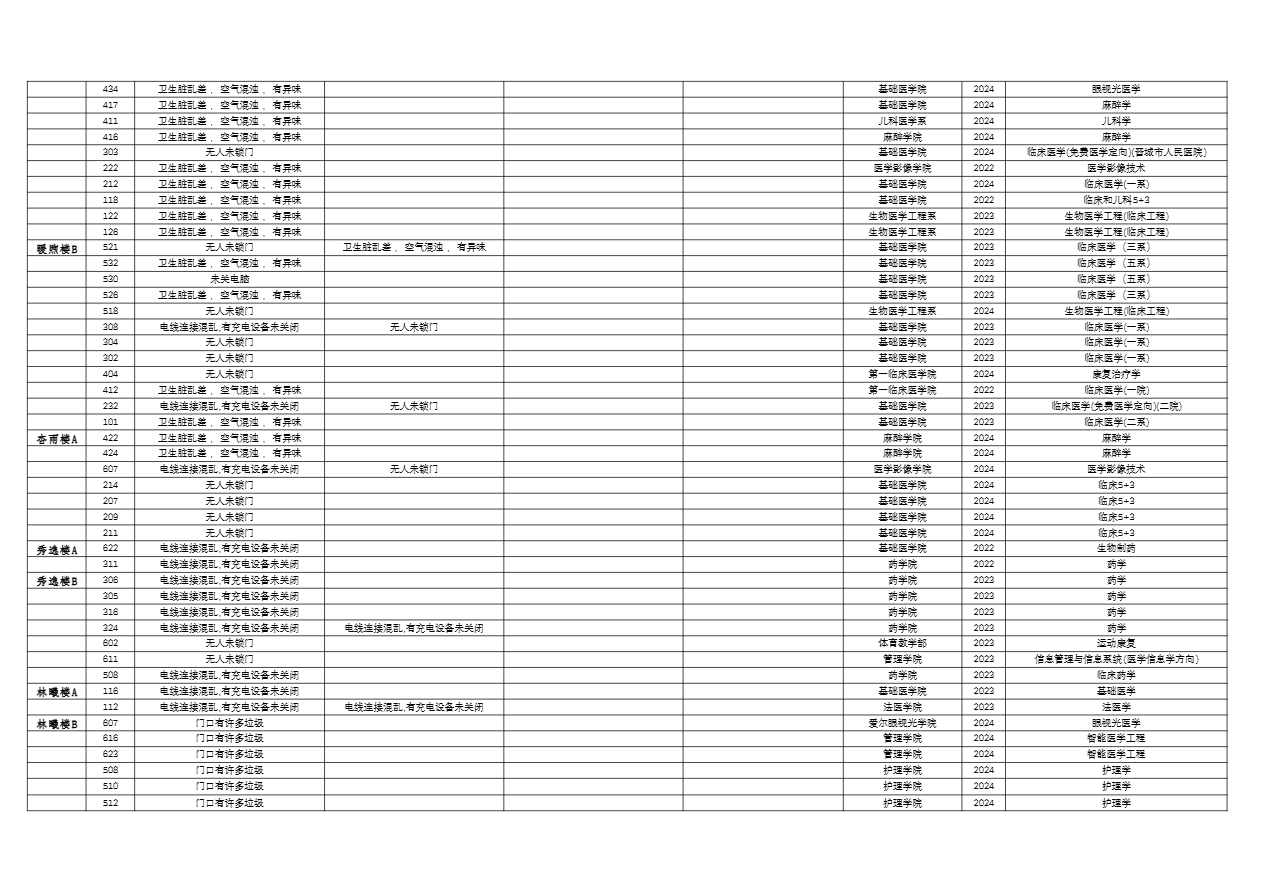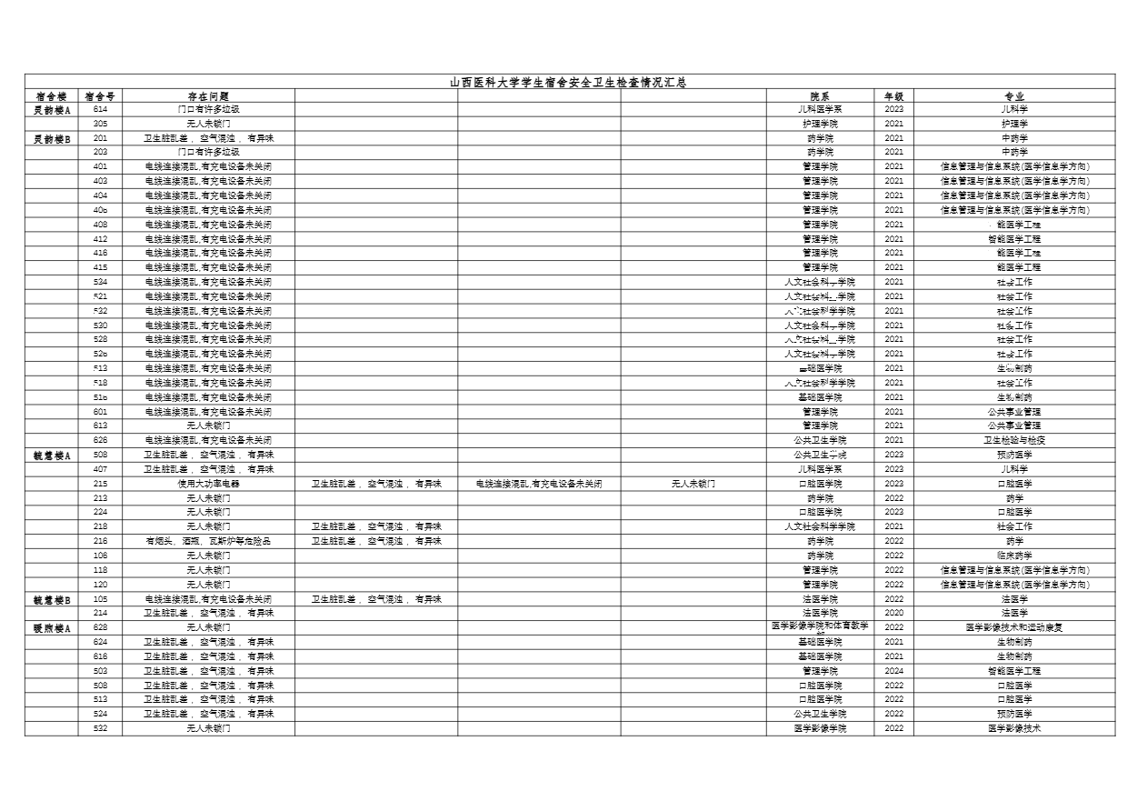 为进一步加强我校学生宿舍安全管理工作,消除各类安全隐患,增强学生的安全防范意识,培养学生良好的生活习惯,创造良好的育人环境,确保学校安全稳定发展。由学生工作部联合研究生学院党委、保卫部、后勤保障部于5月23日下午在中都校区对学生宿舍进行了安全卫生大检查。针对此次检查中存在的问题,各学院(系、部)需予以高度重视,并组织辅导员深入宿舍,核查情况,及时整改,以消除安全隐患。具体检查情况汇总如下: